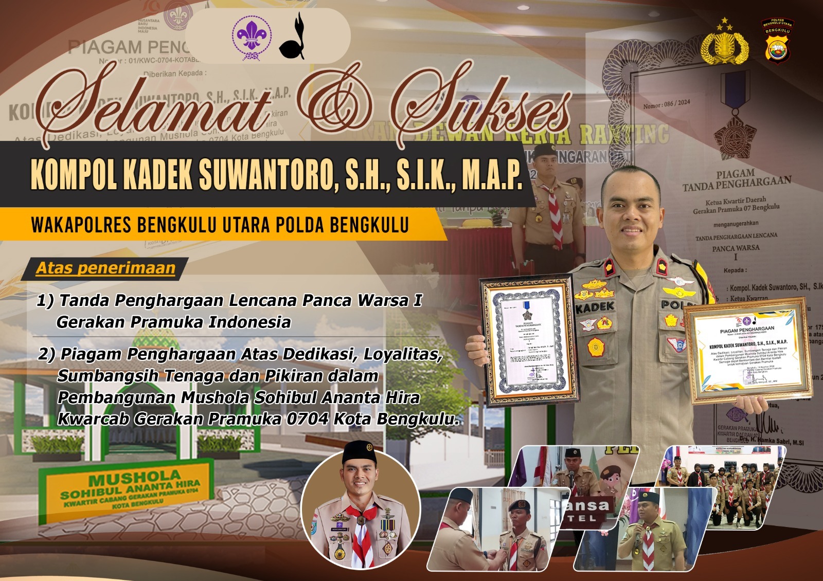 Adapun, untuk penghargaan atas dedikasi, loyalitas, sumbangsih tenaga dan pikiran dalam pembangunan Musala Shibul Ananta Hira Kwarcab Gerakan Pramuka 0704 Kota Bengkulu, diberikan oleh Kwartir Cabang Gerakan Pramuka 0704 Kota Bengkulu yang ditandatangani oleh Ketua Dr. Dedy Wahyudi.
