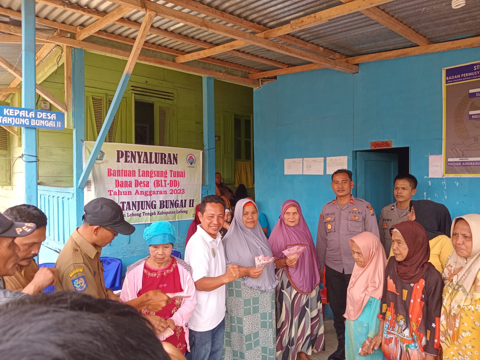 Lebong - Bhabinkamtibmas Polsek Lebong Tengah, Polres Lebong Polda Bengkulu, Briptu Budiono, melaksanakan monitoring kegiatan pembagian BLT DD tahap IV, di Desa Tanjung Bunga II Kecamatan Lebong Tengah, Kabupaten Lebong, Selasa (5/12/2023) siang.