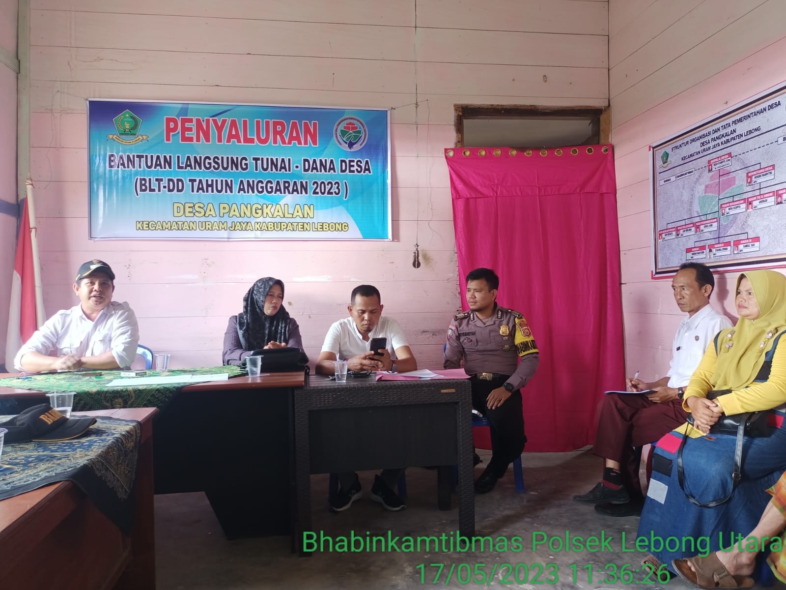 Lebong - Bhabinkamtibmas Polsek Lebong Utara, Polres Lebong Polda Bengkulu Brigpol Novriansyah, menghadiri kegiatan pembagian bantuan langsung tunai (BLT) yang bersumber dari dana desa (DD) di balai Desa Pangkalan Kecamatan Uram Jaya Kabupaten Lebong, Rabu (17/05/2023).