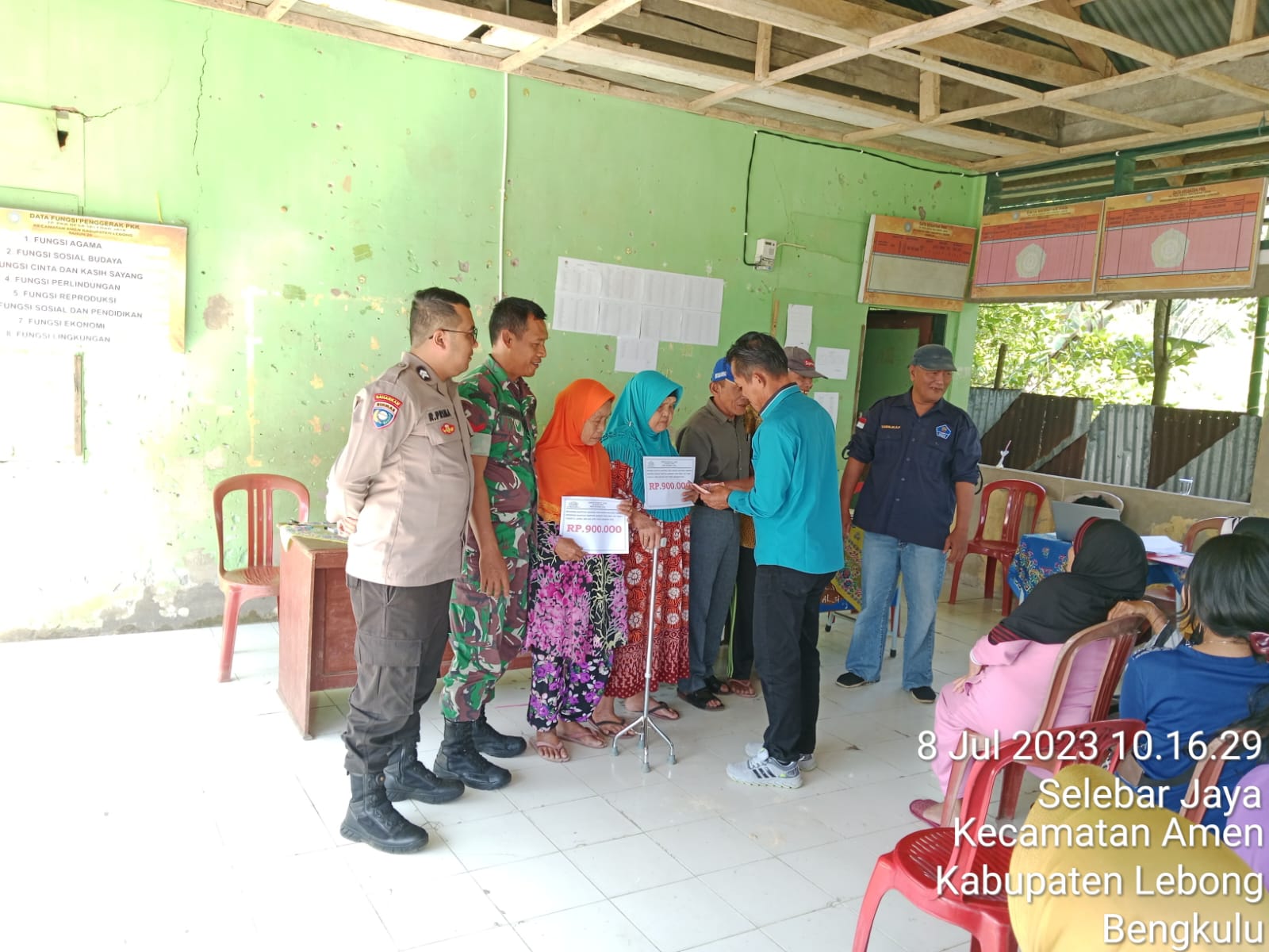 Lebong - Dalam rangka mendukung dan melakukan pendampingan program desa, Bhabinkamtibmas Polsek Lebong Utara, Briptu Rokib Prima, menghadiri kegiatan pembagian Bantuan Langsung Tunai Dana Desa (BLT-DD) ekstrim di Desa Selebar Jaya Kecamatan Amen Kabupaten Lebong, Sabtu (8/7/2023).