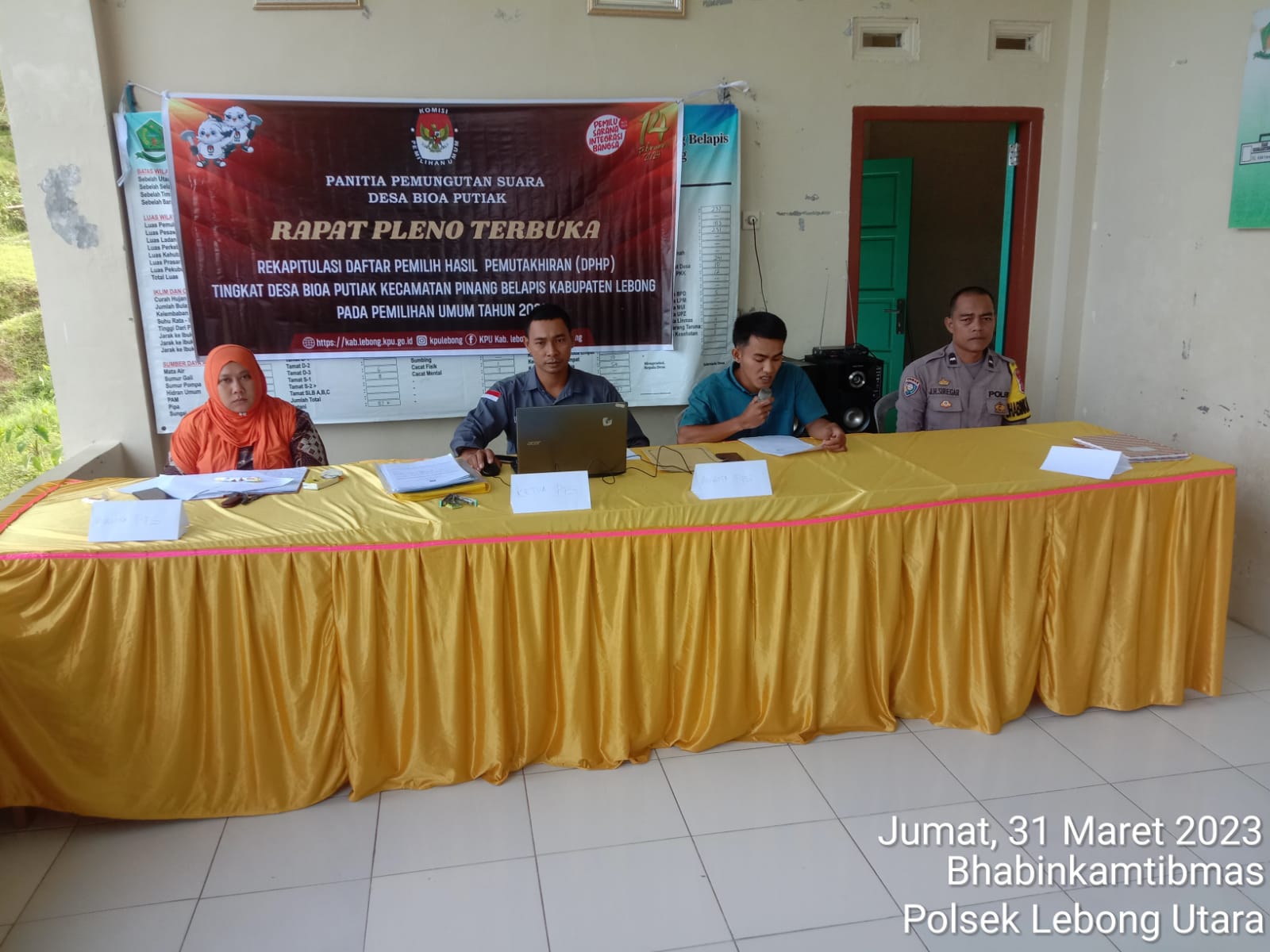 Lebong - Bhabinkamtibmas Polsek Lebong Utara Polres Lebong Polda Bengkulu, Aipda Joko H Siregar, menghadiri Rapat Pleno Terbuka Rekapitulasi Daftar Pemilih Pemuktakhiran (DPHP) Desa Bioa Putiak Kecamatan Pinang Belapis Kabupaten Lebong, Jumat (31/3/2023).