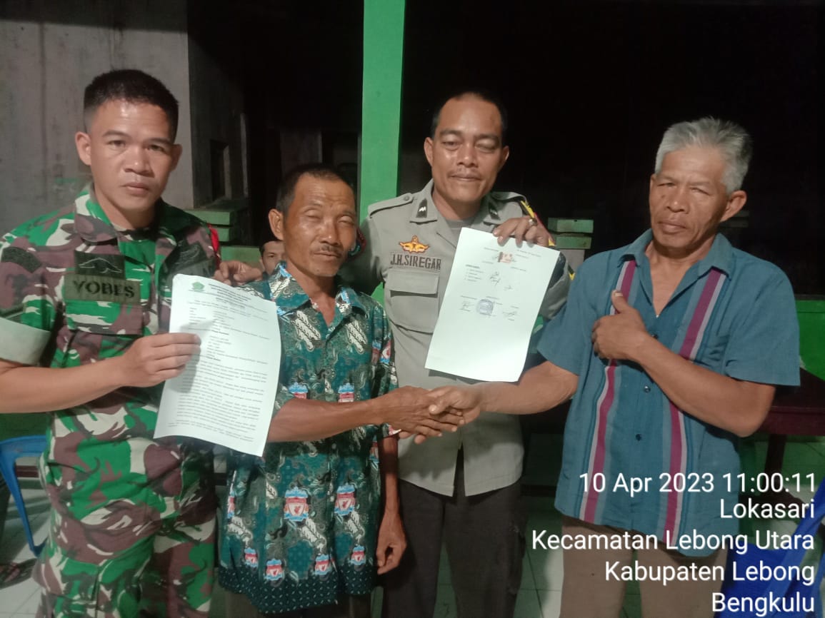 Lebong - Bhabinkamtibmas Polsek Lebong Utara Polres Lebong Polda Bengkulu Aipda Joko Haryono S, melaksanakan problem solving permasalahan perselisihan warga Desa Desa Air Kopras Kecamatan Pinang Belapis, Kabupaten Lebong, Senin (10/4/2023) pagi.