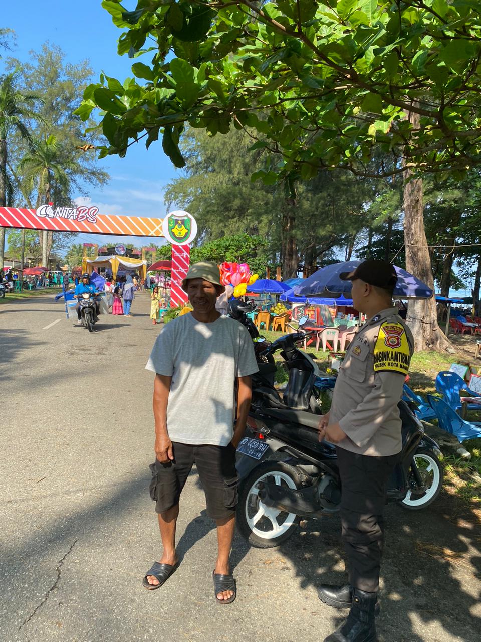 Bengkulu Selatan, - Tingkatkan pelayanan kepada masyarakat Bhabinkamtibmas Polsek Kota Manna Polres Bengkulu Selatan Polda Bengkulu, Bripka Guntur Zulkan S.H., dan Briptu Egi Feroza A, sambangi pedagang dan wisatawan di objek wisata pantai Pasar Bawah Manna Bengkulu Selatan, Minggu (12/06/23).