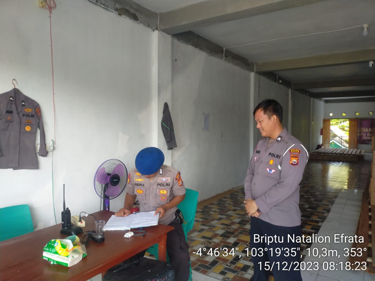 Kaur - Personel piket Satgas Preventif Operasi OMB Polres Kaur Polda Bengkulu, melakukan kegiatan Sistem Pengamanan di gudang Logistik 1,2, dan 3 KPU Kabupaten Kaur, Jumat (15/12/2023).