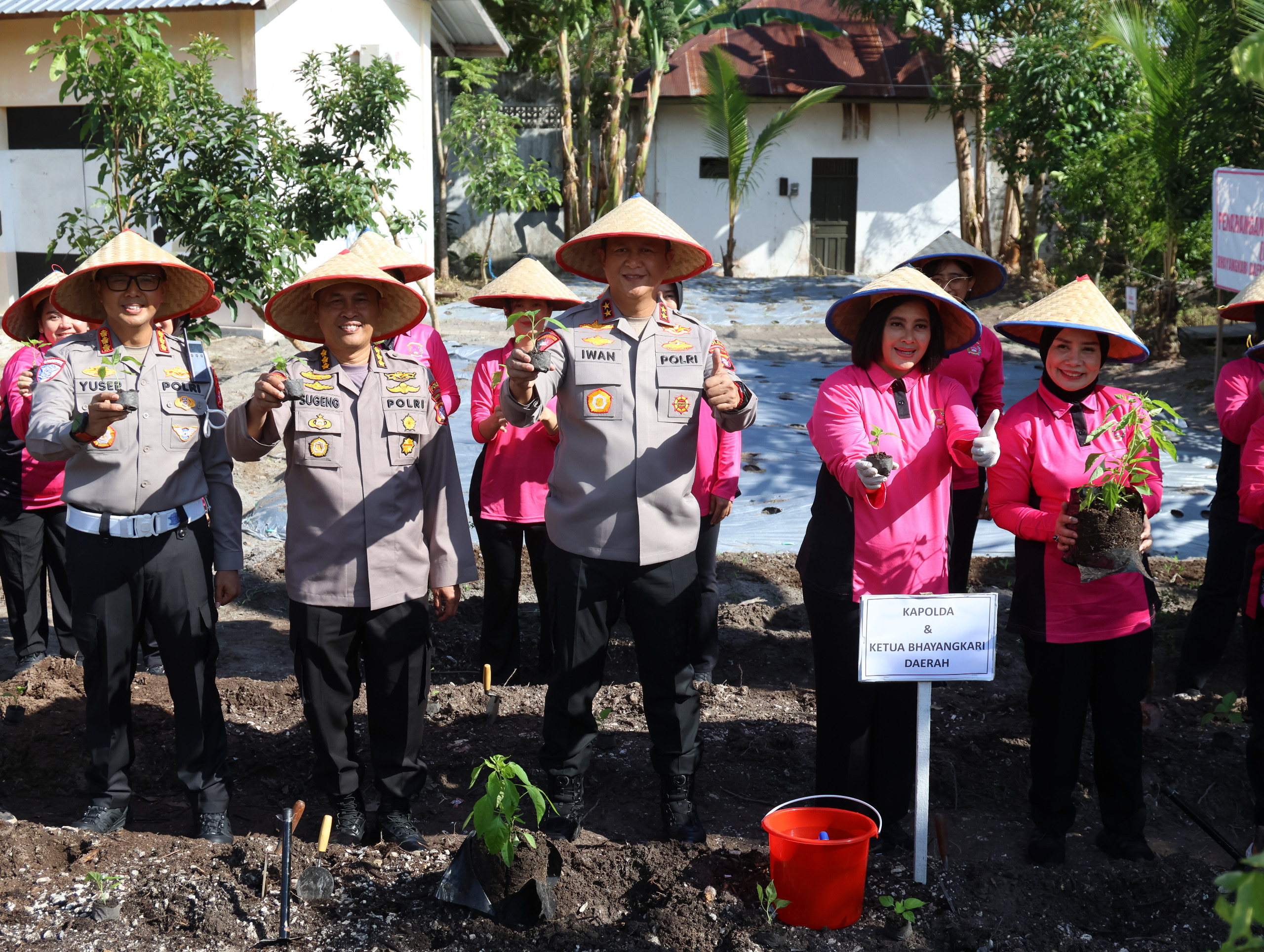 Palangka Raya - Kapolda Kalimantan Tengah Irjen Pol Iwan Kurniawan, S.I.K., M.Si. bersama Ketua Bhayangkari Kalteng Ny. Maya Iwan Kurniawan, melaksanakan kegiatan panen sayuran di lahan Pekarangan Pangan Lestari (P2L), Mapolda setempat, Selasa (26/8/2025).