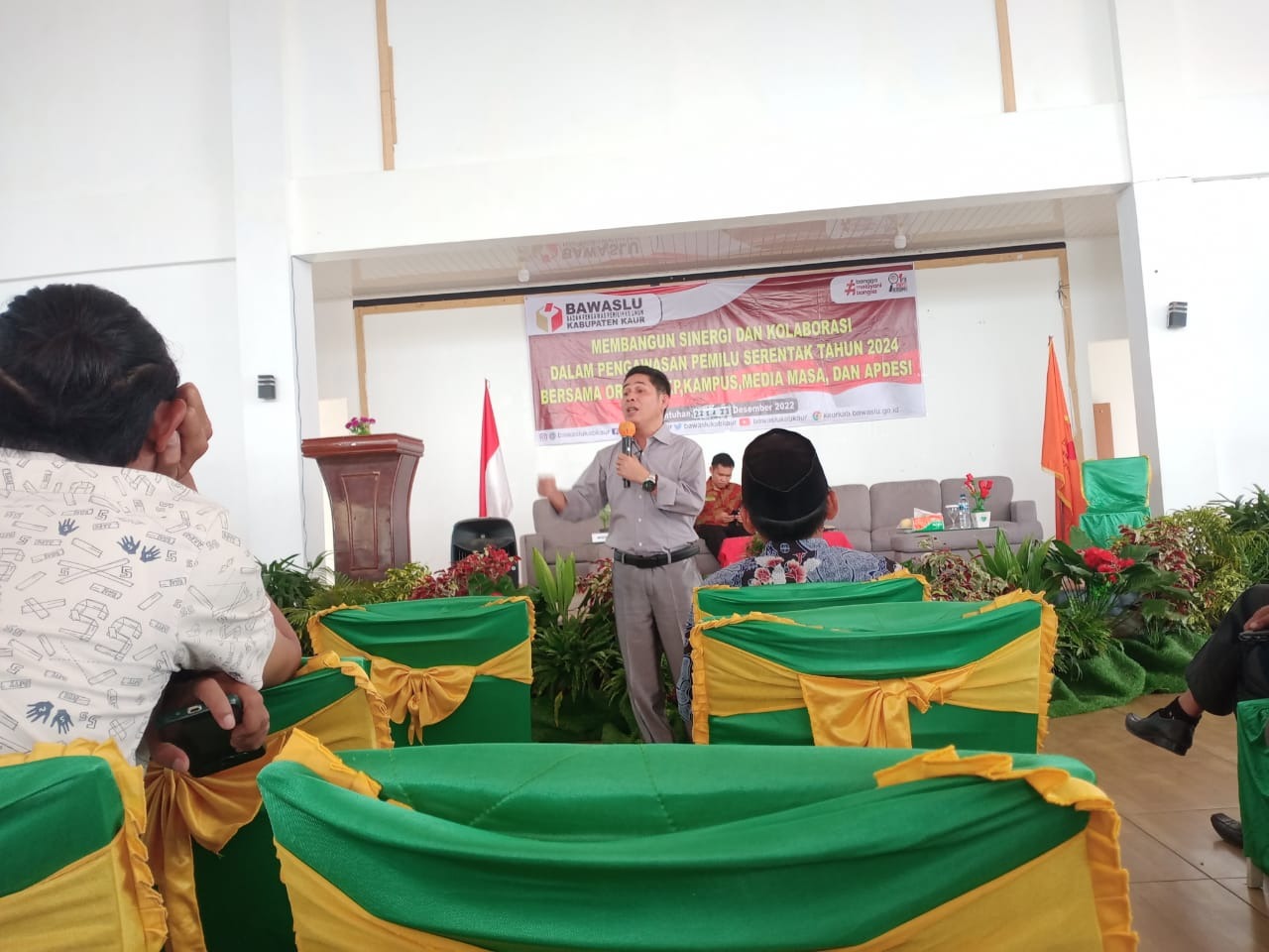 Elfahmi Lubis memaparkan materi dalam kegiatan sosialisasi membangun sinergitas dan kolaborasi dalam pengawasan Pemilu serentak 2024 bersama Ormas, OKP, Kampus, Media Masa dan APDESI yang diselenggarakan oleh Bawaslu Kaur, Jumat (23/12/2022).