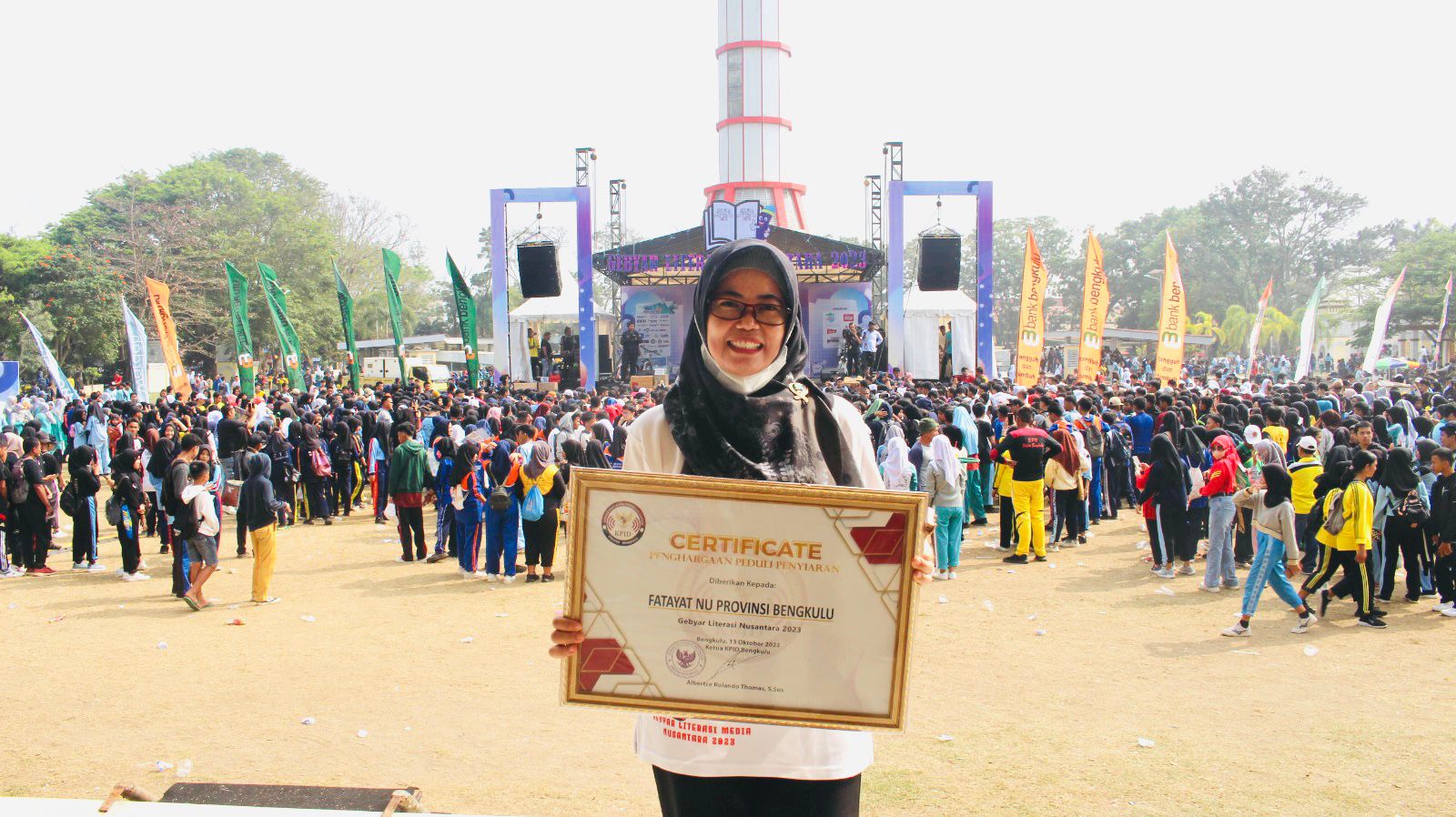 Bengkulu - Ketua PW Fatayat Nahdlatul Ulama Provinsi Bengkulu Fatrica Syafri, M.Pd.I., menerima penghargaan sebagai organisasi perempuan peduli penyiaran dari Komisi Penyiaran Indonesia Daerah (KPID) Bengkulu. Piagam penghargaan diterima oleh Fatrica Syafri pada event Gebyar Literasi Nusantara 2023 di Lapangan Merdeka Balai Raya Semarak Bengkulu, Jumat (13/10/2023).