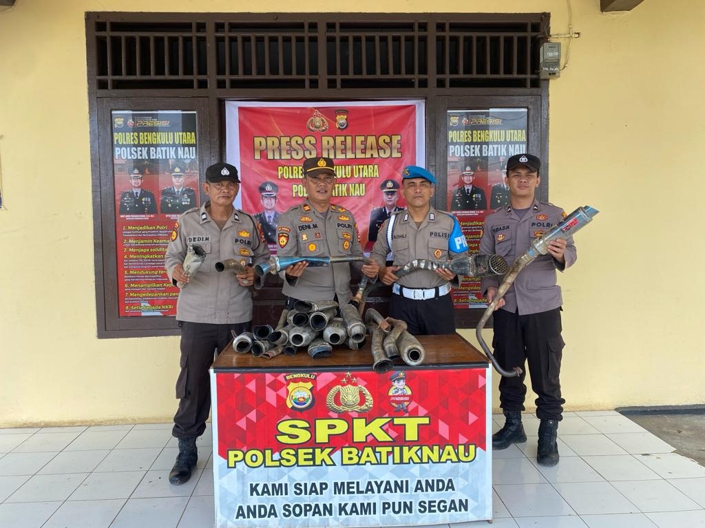 Bengkulu Utara - Kepolisian Sektor Batik Nau melakukan aksi tegas dengan menyita puluhan knalpot tidak standar atau yang dikenal sebagai knalpot brong. Aksi tersebut dilakukan pada kegiatan Press Release yang di gelar pada hari Rabu pagi, (07/2/24), di depan Mako Polsek Batik Nau.
