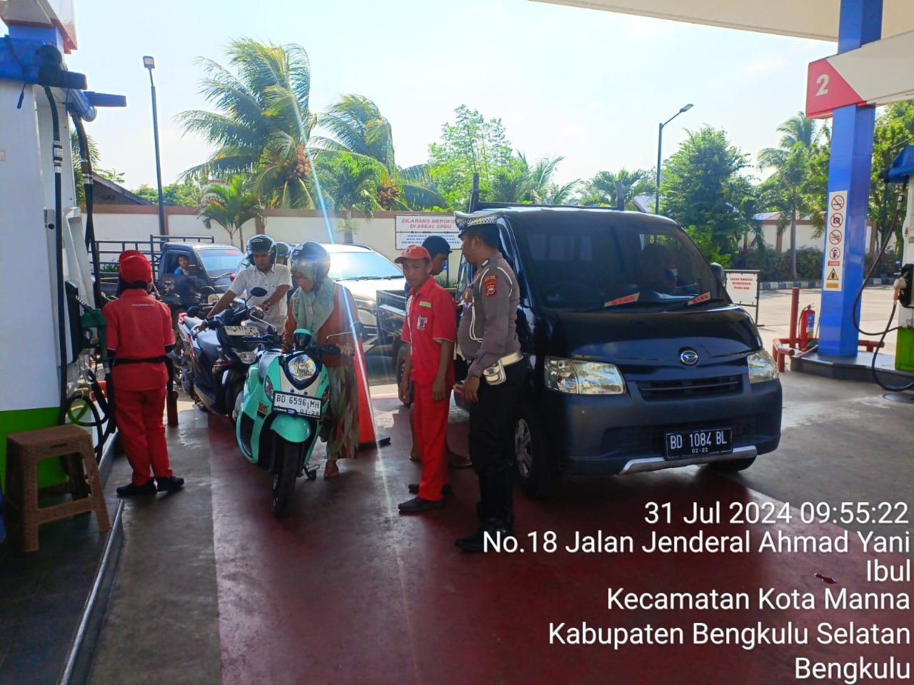 Bengkulu Selatan - Sat Lantas Polres Bengkulu Selatan Polda Bengkulu melaksanakan giat pengawasan pendistribusian dan pengisian BBM serta pengaturan arus lalulintas dimana dianggap berpotensi terjadinya lakalantas di kabupaten bengkulu selatan terutama pada jam jam sibuk aktifitas masyarakat, pada hari Rabu (31/07/24).