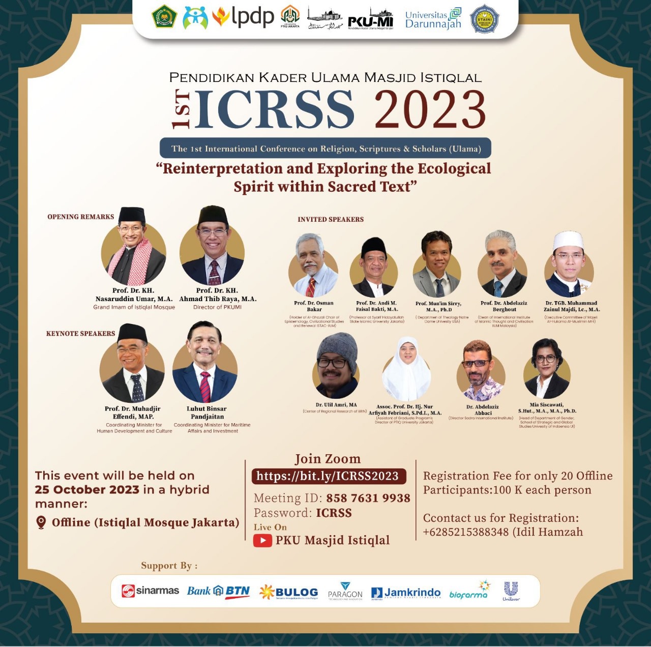 "1st International Conference of Religion, Scriptures, and Scholars (ICRSS) 2023 adalah wadah bagi para akademisi untuk menyampaikan wawasan dan insight dalam bidang akademik, terkhusus studi Islam, dalam menanggapi isu aktual yang kini menjadi perbincangan di lingkungan PBB, yaitu isu ekologi" ungkap Prof. Dr. KH. Nasaruddin Umar, MA Imam Besar Masjid Istiqlal.