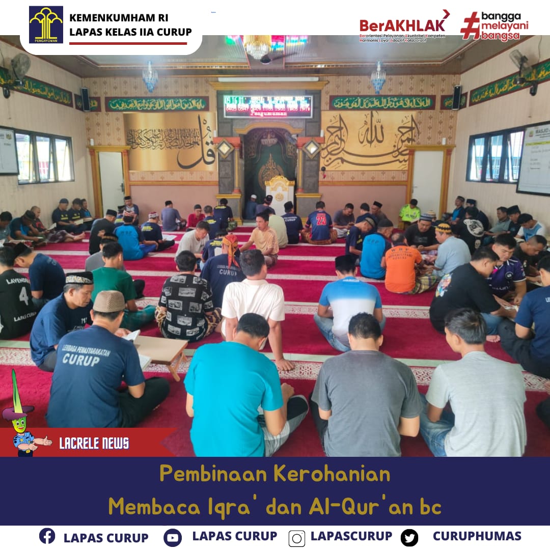Lapas Klas II A curup terus berupaya untuk mengoptimalkan dan meningkatkan kualitas program pembinaan kerohanian pembelajaran iqra' dan Alqur'an bagi WBP yang mana kegiatan ini sudah rutin dilaksanakan secara bergantian dan terjadwal pada masing - masing blok hunian dalam setiap harinya.