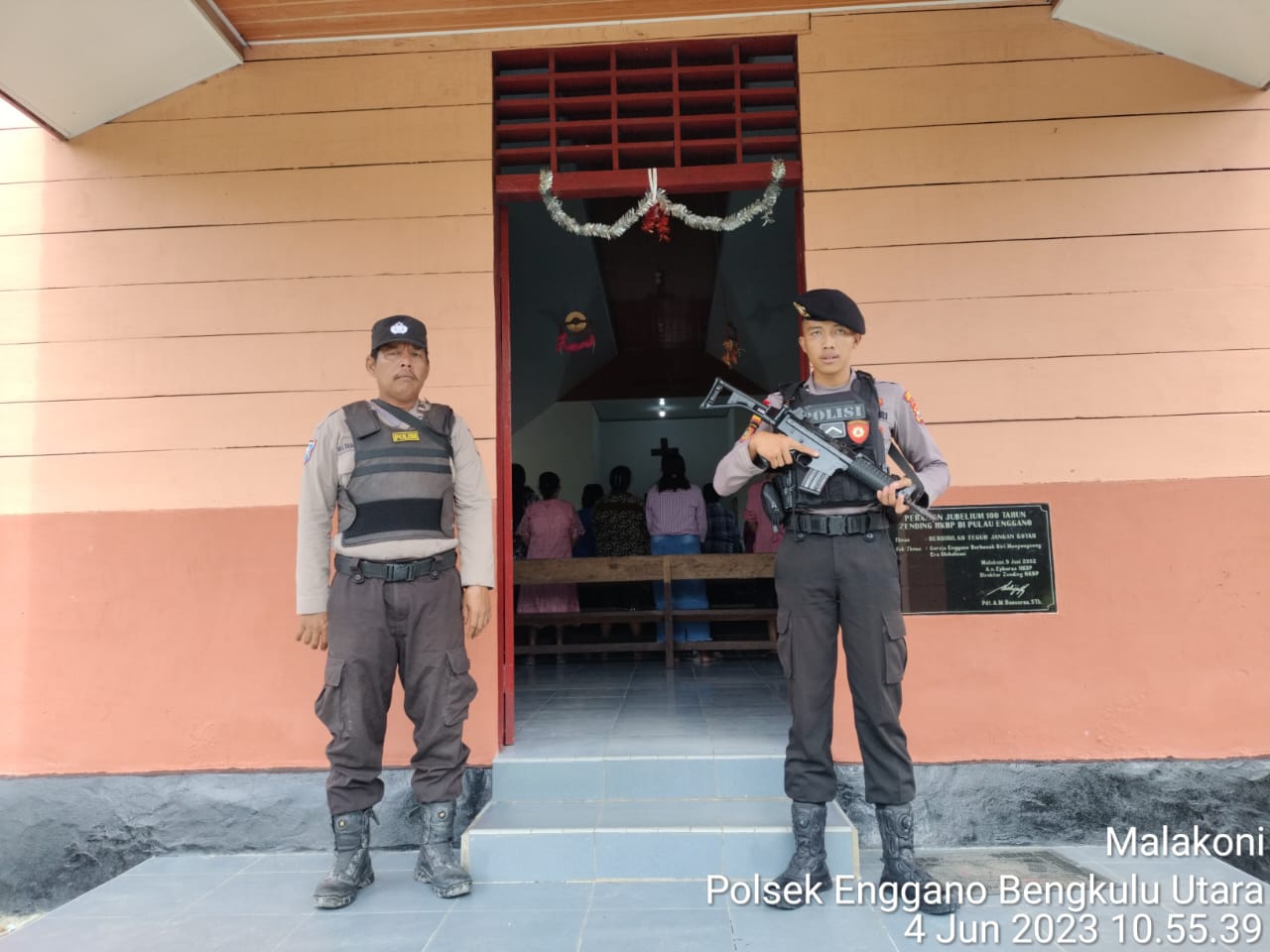 Bengkulu Utara - Memberikan rasa aman dan nyaman, serta antisipasi gangguan Kamtibmas, anggota Polsek Enggano Polres Bengkulu Utara Polda Bengkulu, Aipda H.A.Tampubolo dan Bripda Yuda Irawan melaksanakan giat pengamanan dan monitoring ke beberapa tempat ibadah gereja HKBP PKPE Desa Malakoni Kecamatan Enggano Kabupaten Bengkulu Utara, Minggu (04/5/2023)