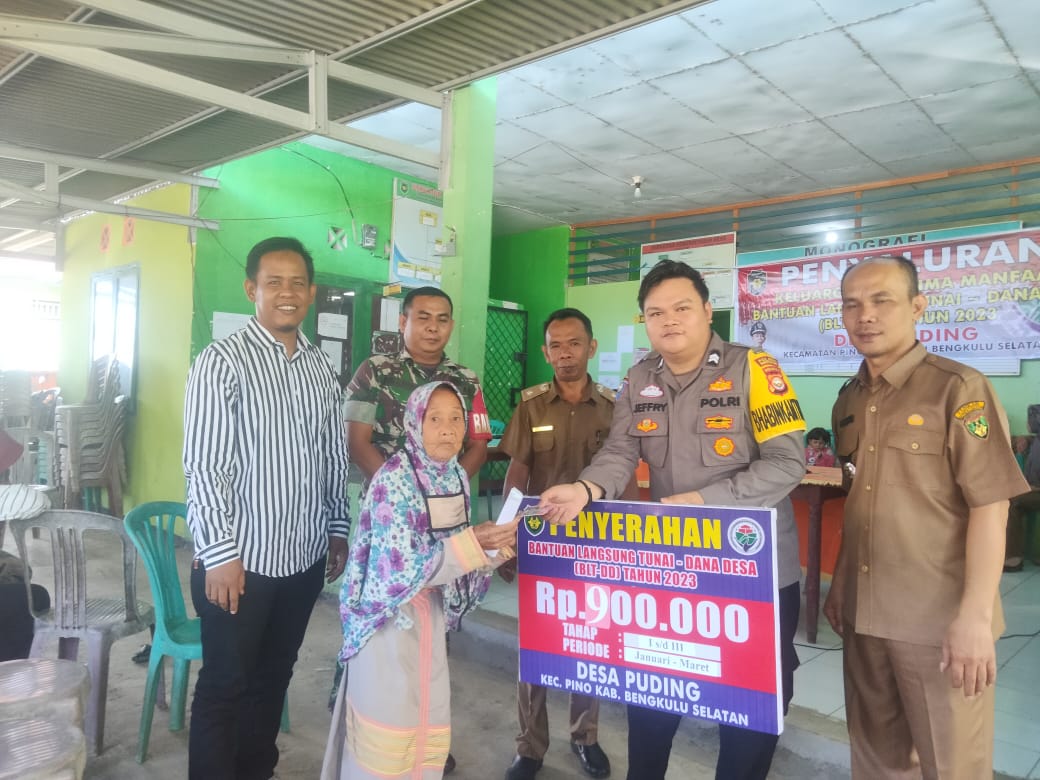 Bengkulu Selatan – Bhabinkamtibmas Polsek Pino Polres Bengkulu Selatan Polda Bengkulu dan Babinsa monitoring saat pemerintah Desa Puding Kecamatan Pino Kabupaten Bengkulu Selatan memberikan bantuan langsung tunai BLT-DD, bertempat di Kantor Desa Puding Kecamatan Pino Kabupaten Bengkulu Selatan, Selasa (28/3/2023) pagi