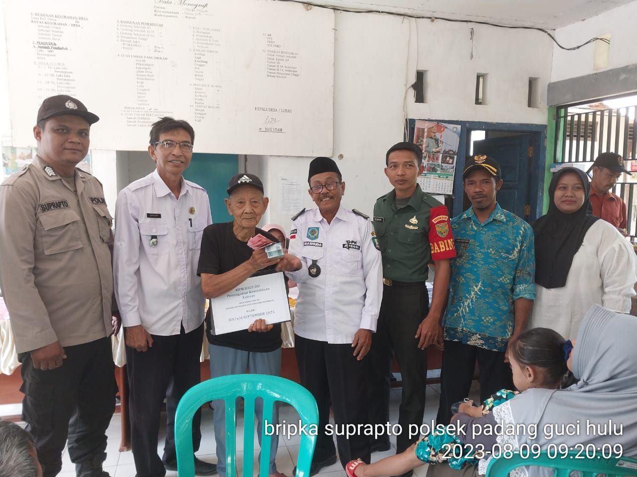 Kaur - Bhabinkamtibmas Polsek Padang Guci Hulu Polres Kaur Polda Bengkulu melakukan monitoring pembagian BLT-DD Tahap III Tahun 2023 di Desa Margo Mulyo Kecamatan Padang Guci Hulu Kabupaten Kaur, Rabu (09/08/2023) pukul 08.30 WIB s/d selesai.