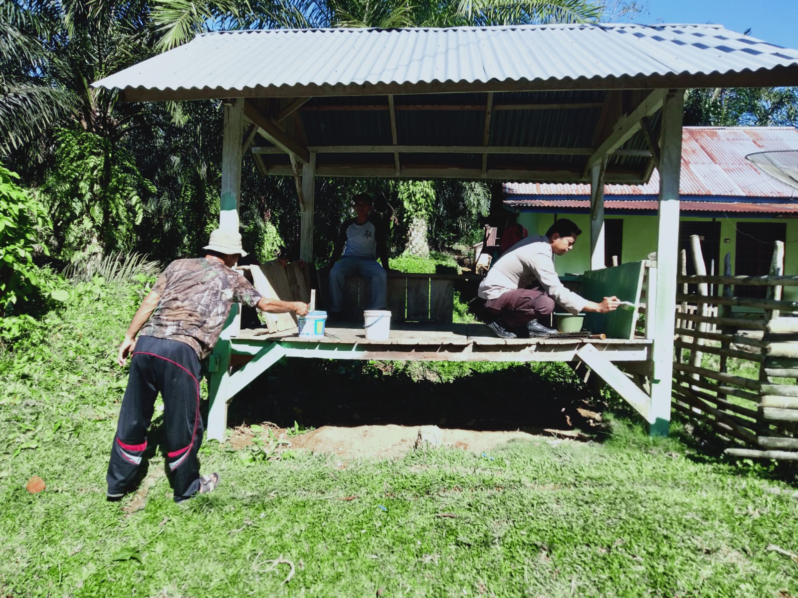 Bengkulu Selatan, - Bhabinkamtibmas Polsek Pino Polres Bengkulu Sealatan Polda Bengkulu, Bripka Dolly Frieze Lubis, S.H., bersama-sama dengan warga binaannya melakukan renovasi Pos Kamling di Desa Batu Kuning Kecamatan Ulu Manna, Kabupaten Bengkulu Selatan, Jumat (7/4/23) Siang.