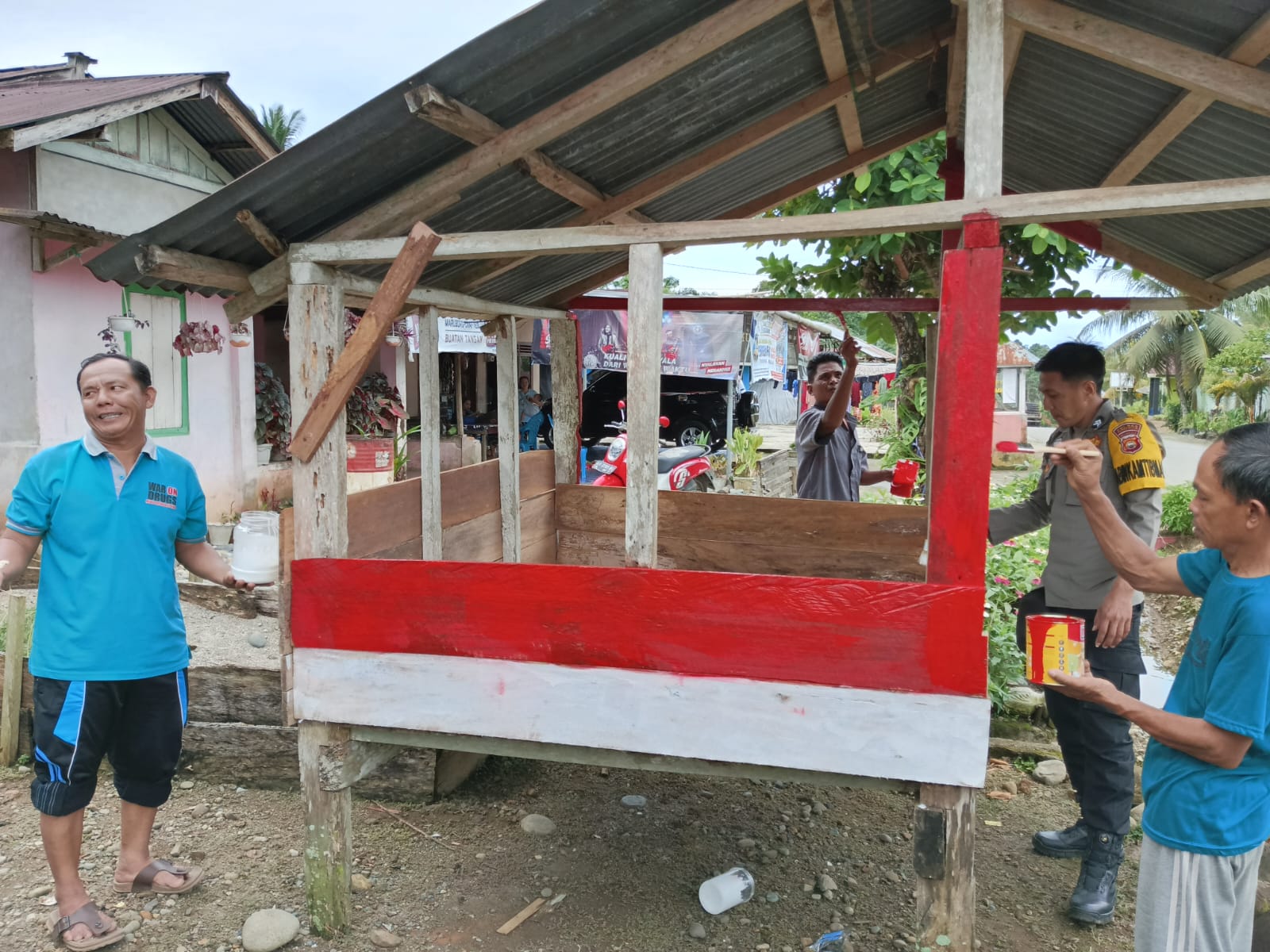 "Alhamdulilah, warga desa Simpang Pino Kecamatan Pino selalu guyub dan rukun. Salah satunya seperti hari ini kita gotong royong dirikan Pos Kamling," ucap Briptu Roby.S