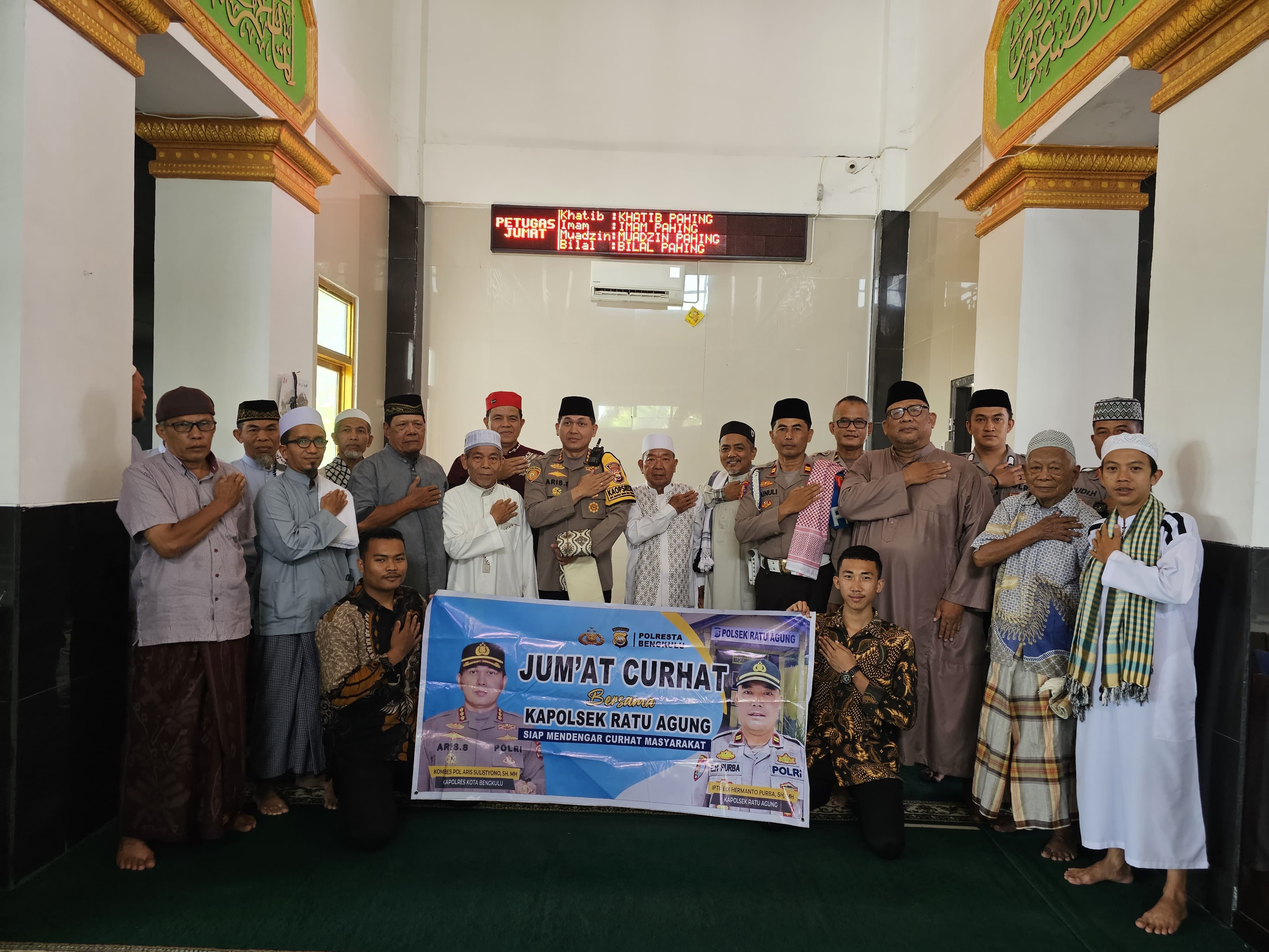 Bengkulu - Dalam rangka cooling system, Kapolresta Bengkulu Polda Bengkulu Kombes Pol Aris Sulistyono melaksanakan Jumat Curhat, di Masjid Al Iman Kecamatan Ratu Agung Kota Bengkulu, Jumat (17/11/2023).