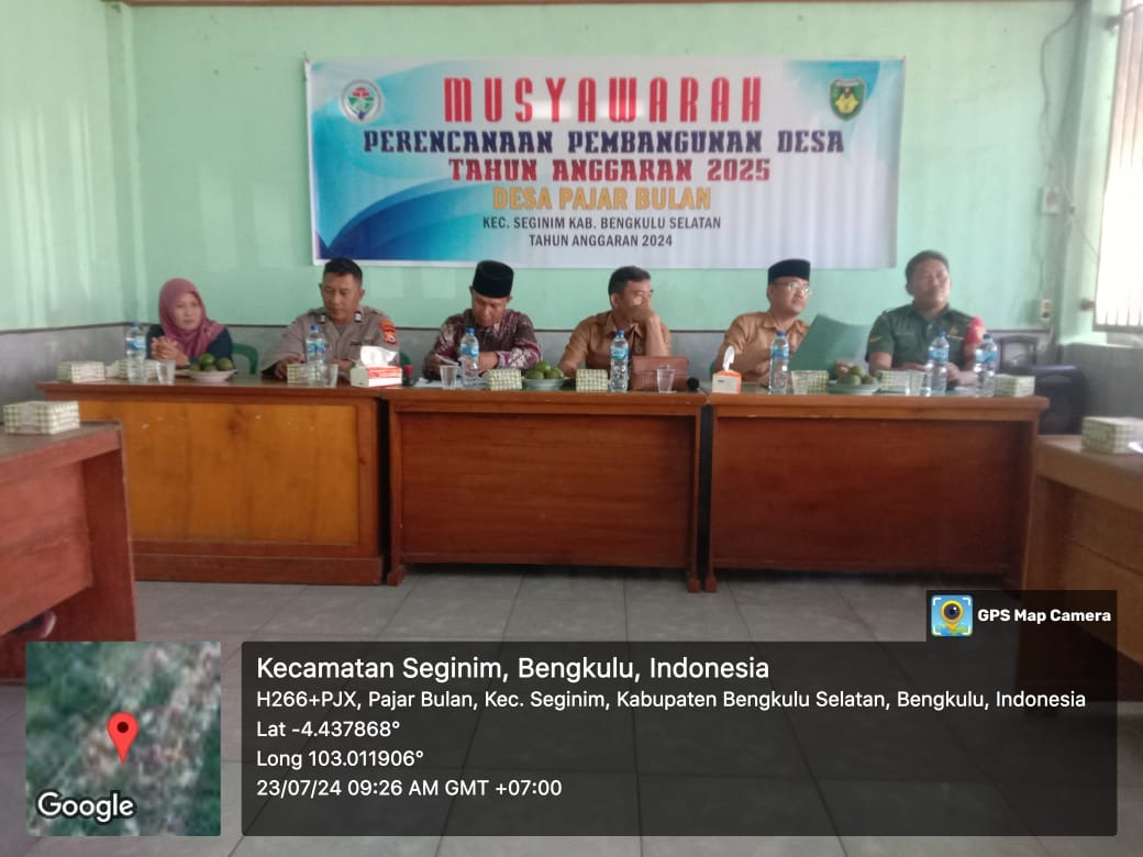 Bengkulu Selatan – Kanit Binmas Polsek Seginim mewakili Kapolsek Pino Polres Bengkulu Selatan Polda Bengkulu, Aiptu Sigit Hartanto menghadiri Musyawarah Rencana Pembangunan Desa Rencana Kerja Tahun 2025, desa Pajar Bulan Kecamatan Seginim kabupaten Bengkulu Selatan, Selasa (23/07/24).