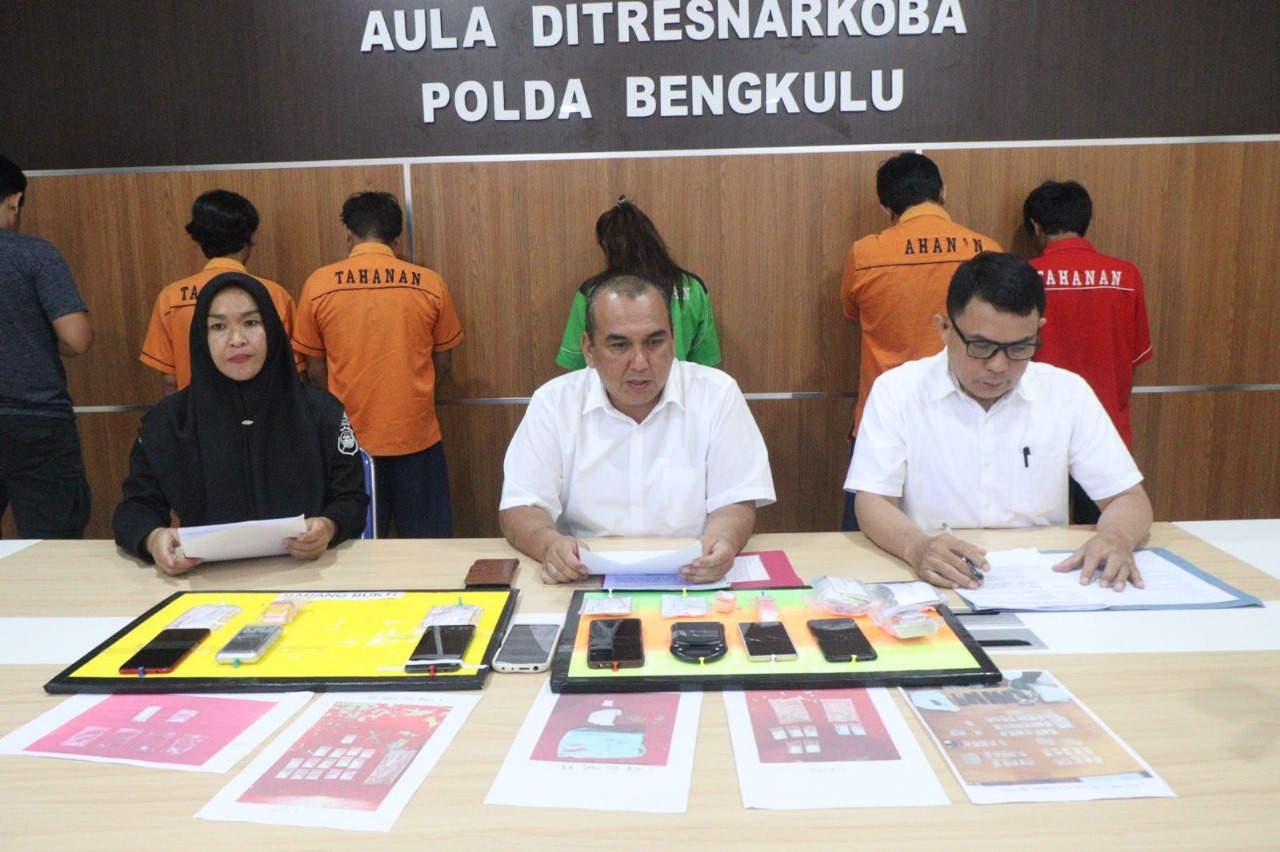 Wadir Resnarkoba Polda Bengkulu AKBP Tonny Kurniawan S.I.K., saat menggelar konferensi pers yang didampingi juga oleh PS Kasubdit 3 Ditresnarkoba Polda Bengkulu Kompol David Tampubolo S.H.,dan Paur Pensat Subdit Penmas Bidhumas Polda Bengkulu Iptu Desty mengatakan penangkapan pelaku berawal diperoleh informasi dari masyarakat bahwa di jalan DP. Negara II RT 25 RW 05 Kelurahan Pagar Dewa Kecamatan Selebar Kota Bengkulu sering menjadi tempat penyalahgunaan atau transaksi Narkotika jenis sabu. Menindaklanjuti informasi tersebut personel Subdit III melakukan penyelidikan mendalam dan pada Hari Minggu Tanggal 25 Februari 2024 Pukul 21.50 WIB dilakukan penggerebekan serta terduga para pelaku berhasil diamankan berikut barang bukti.