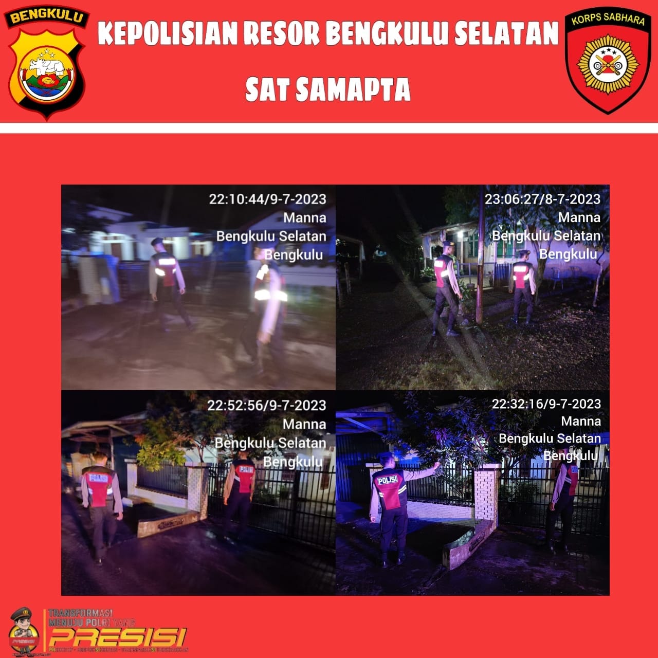 Dalam kegiatan Patroli kali ini Sat Samapta Polres Bengkulu Selatan  memberikan imbauan Kamtibmas kepada masyarakat serta menyampaikan pesan kamtibmas serta memberi pesan agar selalu waspada terhadap tindak pidana Curat, Curas dan Curanmor.