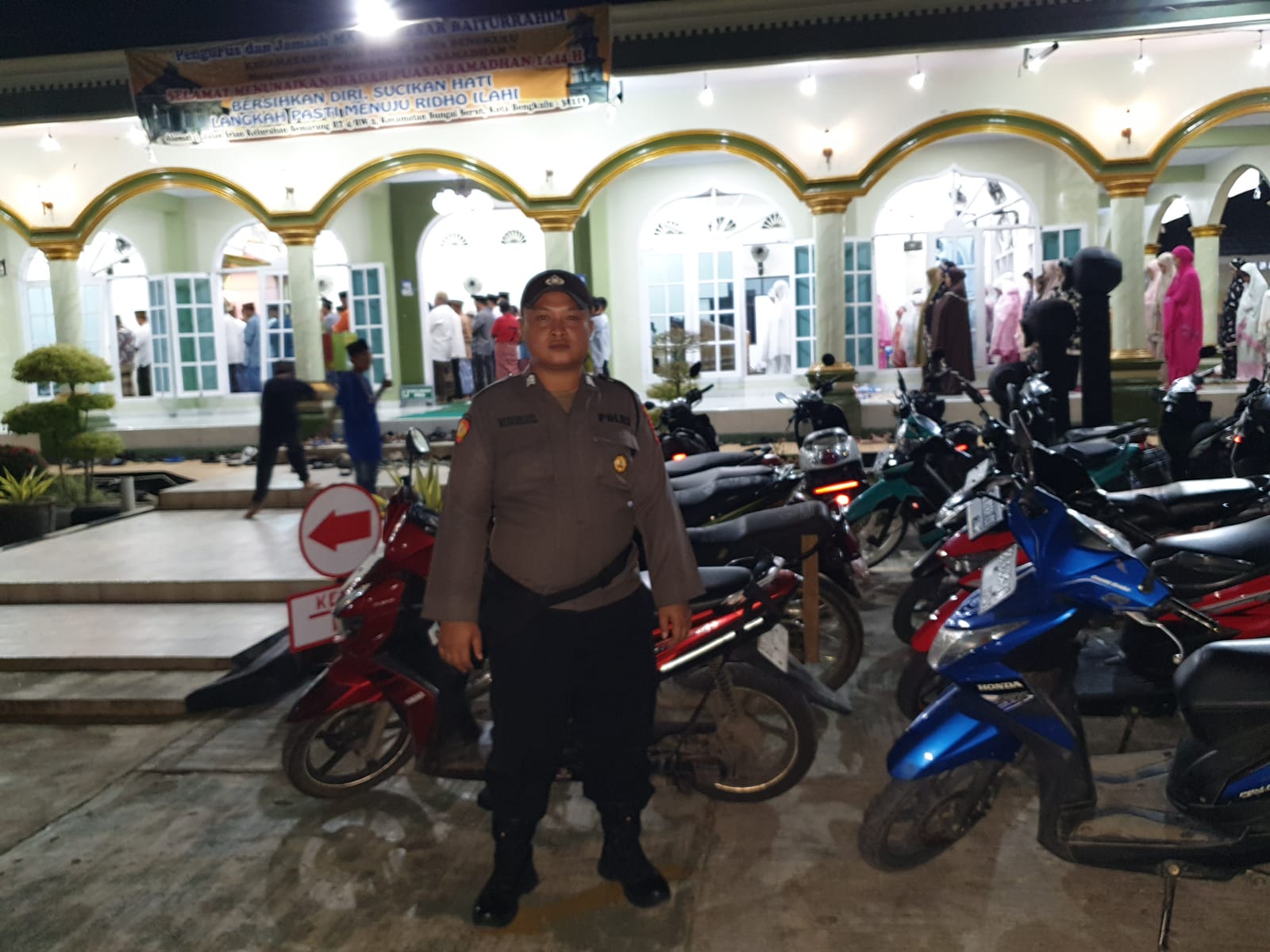 Bengkulu - Polsek Teluk Segara Polresta Bengkulu Polda Bengkulu, mengerahkan personelnya untuk melakukan penjagaan di Masjid Baiturrahim di Kelurahan Semarang Kecamatan Sungai Serut Kota Bengkulu, saat pelaksanaan ibadah Salat Tarawih, Sabtu (25/3/2023) malam.