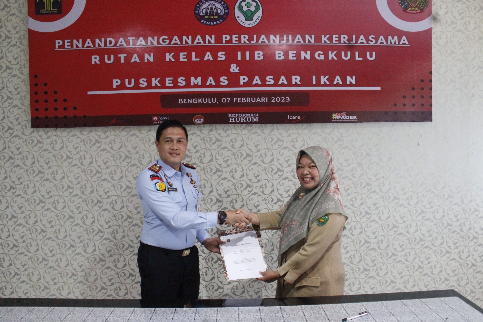Penandatanganan ini dilakukan langsung oleh Kepala Rutan Farizal Antony dan Kepala Puskesmas dr.R.A.Yeni Warningsih. Perjanjian Kerjasama ini juga merupakan bentuk sinergitas antara Rutan Bengkulu dan Puskesmas Pasar Ikan yang merupakan lembaga di satu wilayah Teluk Segara. Tujuan Rutan Bengkulu melakukan kerjasama ini yaitu agar puskesmas pasar ikan mendukung penuh semua kegiatan medis Rutan Bengkulu terhadap WBP maupun masyarakat dan begitupun juga sebaliknya.