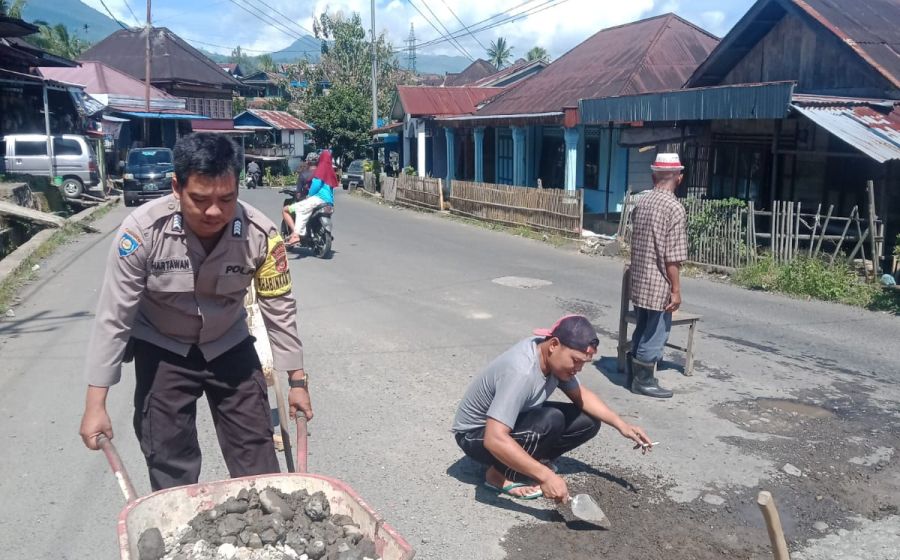 Bhabinkamtibmas di Lebong Bantu Perbaiki Jalan Berlubang