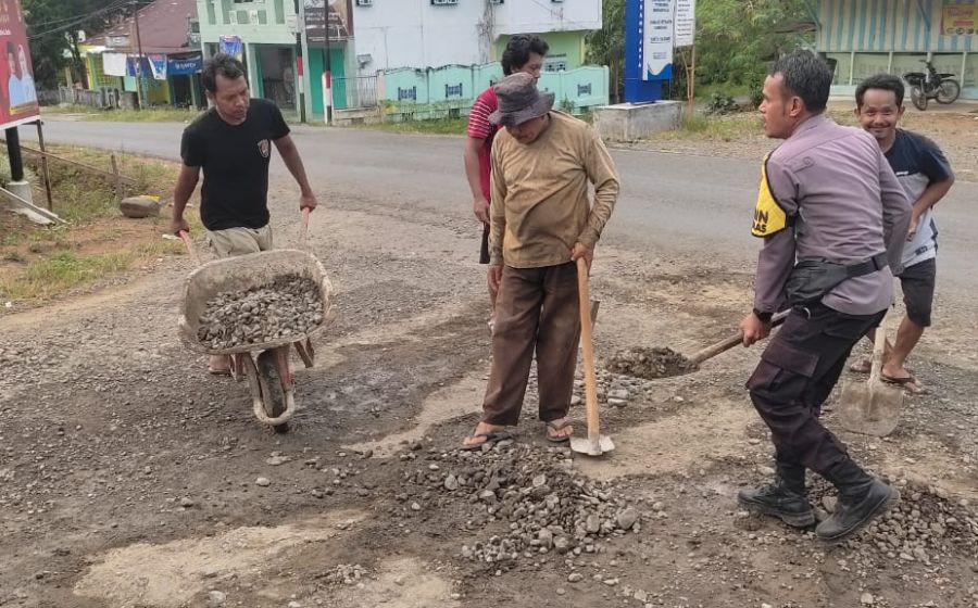 Peduli Keselamatan Masyarakat, Polsek Padang Jaya Tambal Jalan Berlubang Bersama Warga