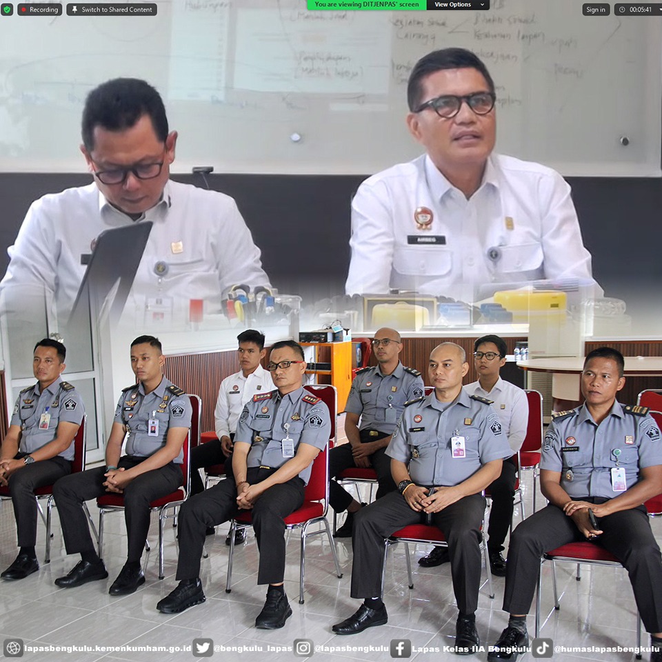 Bengkulu - Kepala Lapas Kelas IIA Bengkulu, Yuniarto, beserta jajarannya mengikuti rapat virtual bertempat di Aula Lapas Kelas IIA Bengkulu, terkait percepatan program pelaksanaan anggaran tahun 2025 dan tindak lanjut Surat Keputusan (SK) Tiga Menteri, yaitu Menteri Hukum, Menteri HAM, serta Menteri Imigrasi dan Pemasyarakatan.
