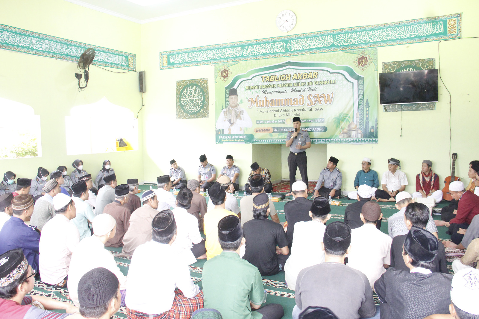 KOTA BENGKULU - Dalam rangka memperingati Maulid Nabi Muhammad SAW 1445 H, senin (9/10), Rumah Tahanan Negara Kelas II B Bengkulu menggelar kegiatan Tablig Akbar bersama Ustadz Muhammad Fadhli di Masjid At-Taubah Rutan Bengkulu. Kegiatan tersebut dihadiri langsung oleh Kepala Rutan, Farizal Antony didampingi sejumlah pejabat struktural, staf pegawai dan Warga Binaan Pemasyarakatan (WBP) Rutan Bengkulu.