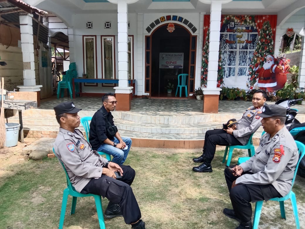 Kapolsek Giri Mulya Ipda Alfalino Sh Bersama Personil Polsek Giri Mulya Aiptu Jhon Tulus, Aiptu Hadi Purnomo, Bripka Wisnu Nugroho dan Brigpol Try Hartanto melaksanakan giat pengamanan ibadah perayaan Natal di Gereja GPDI desa Wonoharjo untuk memastikan keamanan para jemaat yang merayakan ibadah Natal 2023.