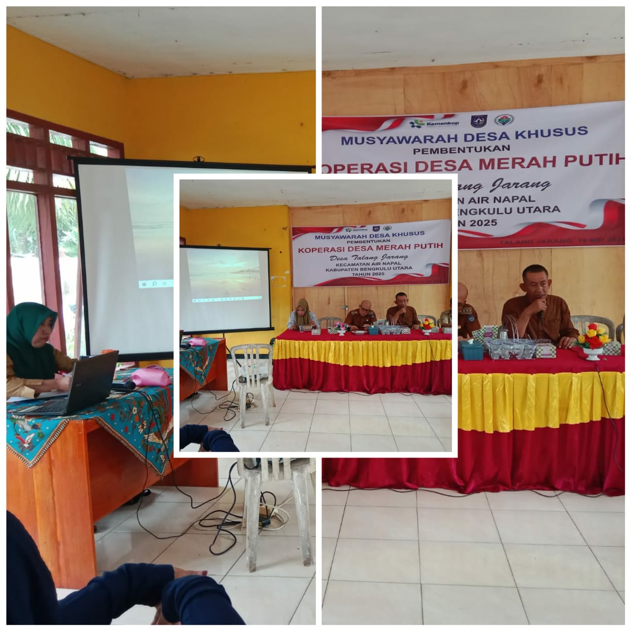 Dutawarta.id - Pemerintah Desa Talang Jarang Kecamatan Air Napal Kabupaten Bengkulu Utara menggelar Musyawarah Desa Khusus pembentukan Koprasi Desa Merah Putih tahun 2025 yang dilaksanakan di aula kantor desa Talang Jarang, Senin (19/5/2025).