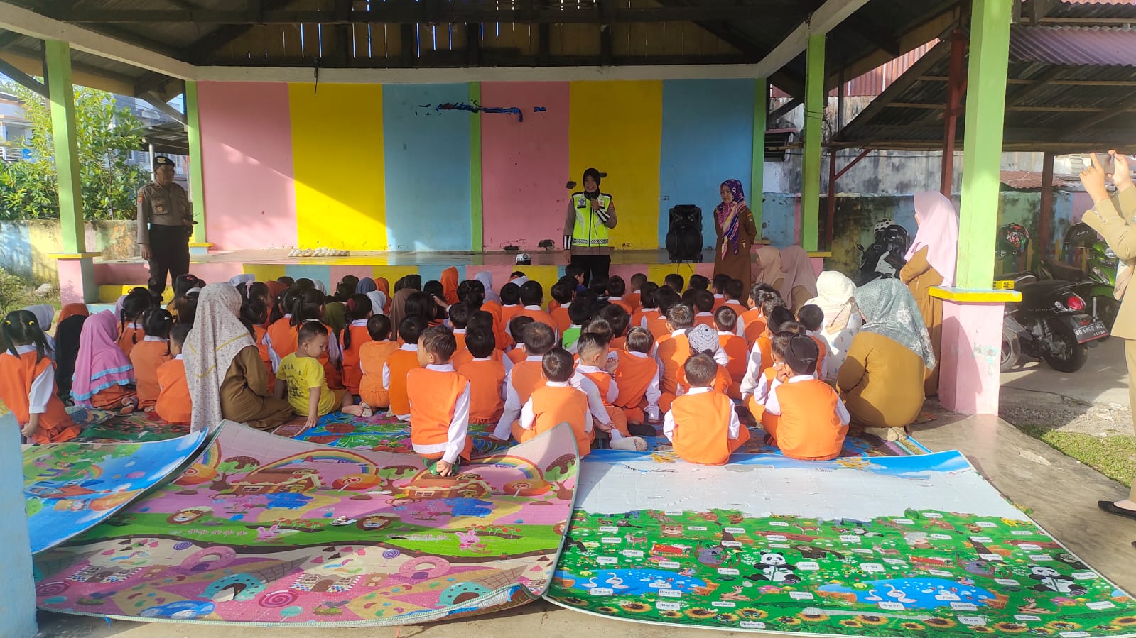 Bengkulu Selatan - Personel Sat Lantas Polres Bengkulu Selatan Polda Bengkulu Aipda Anita dan Bripda Iwan Ben sambangi anak-anak TK.I Bengkulu Selatan sebagai Polisi anak Selasa, (23 Mei 2023).