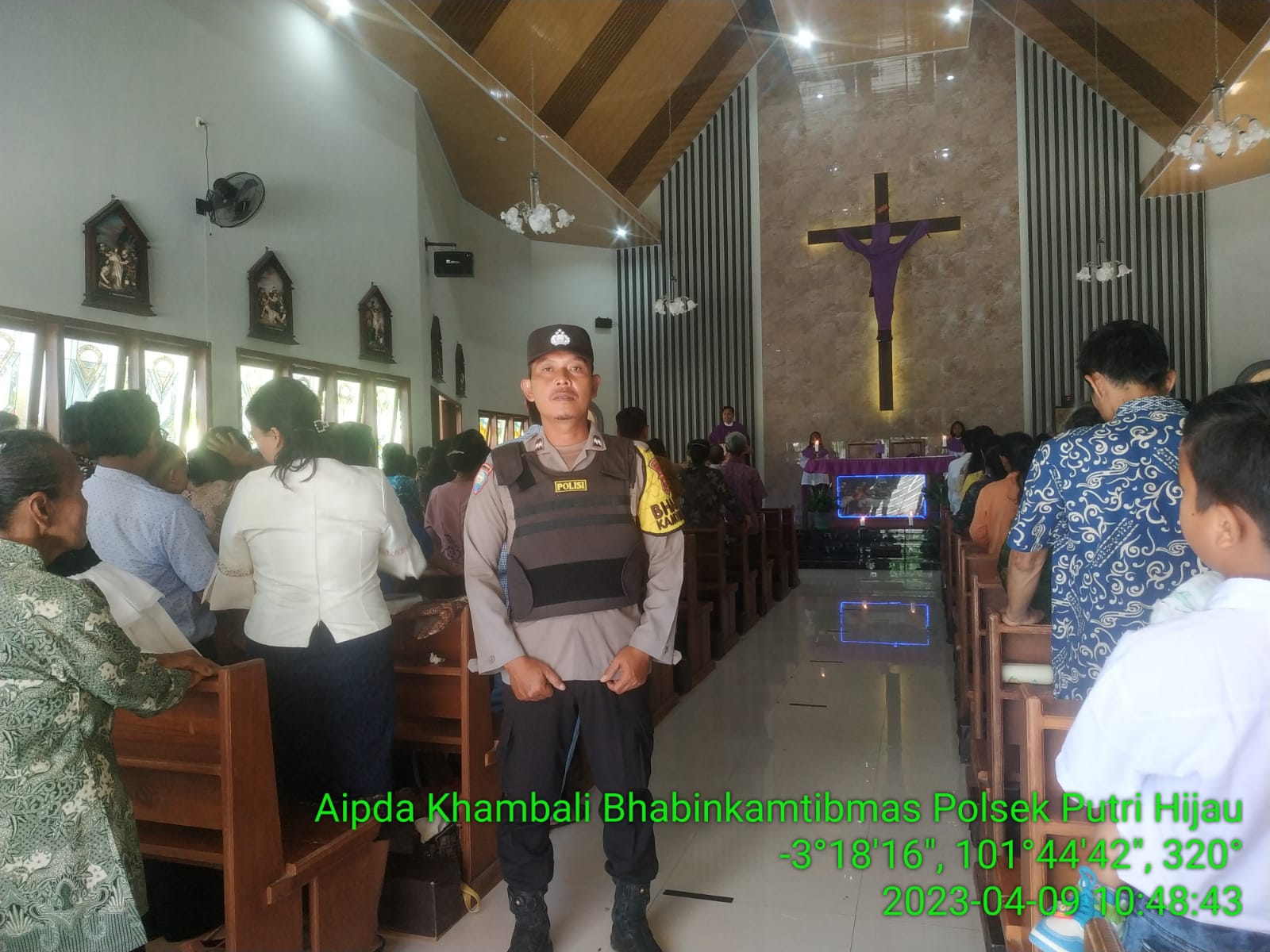 Kepolisian Sektor Putri Hijau Polres Bengkulu Utara Polda Bengkulu, menggelar pengamanan ibadah Hari Raya Paskah yang dilaksanakan di Gereja Katholik ST Tarsius, Minggu (9/4/2023).
