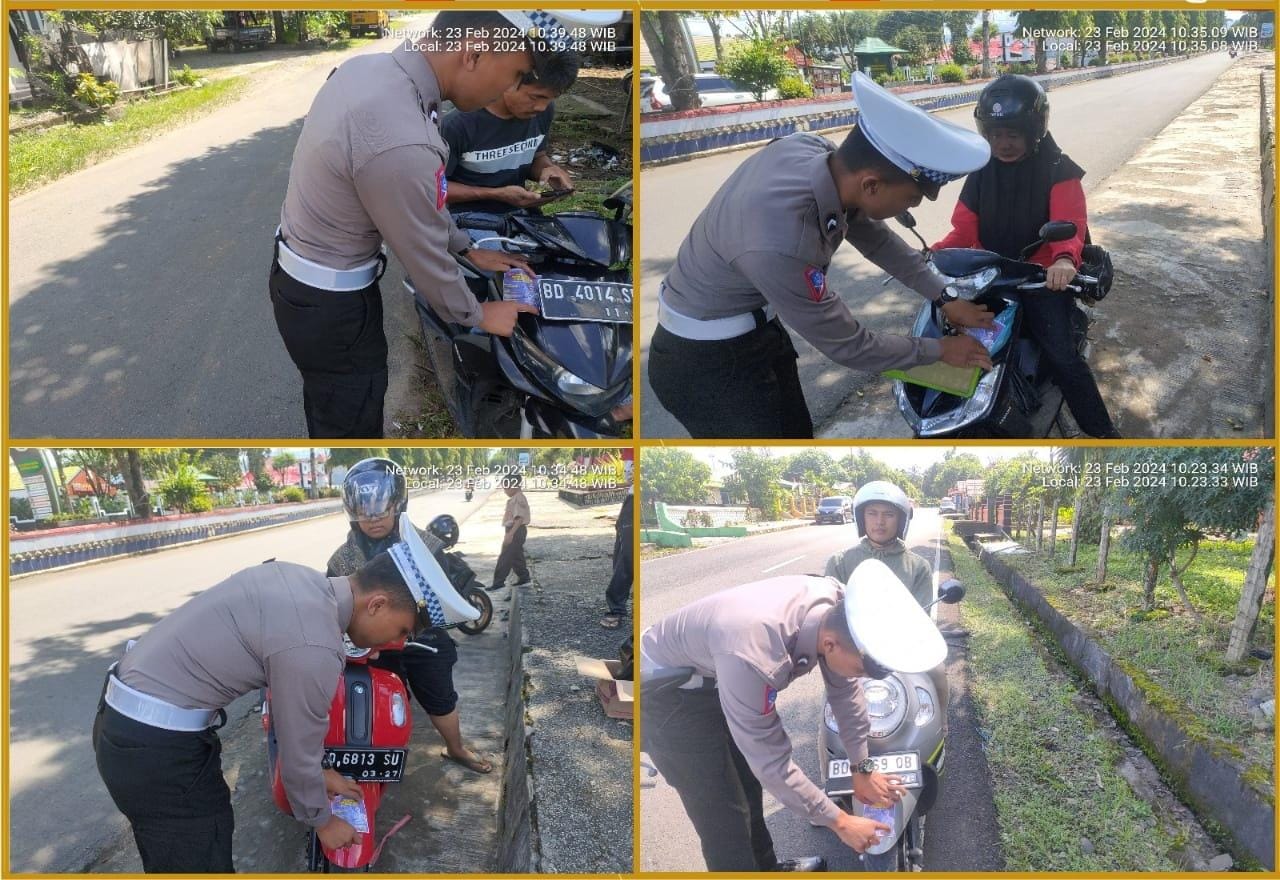 Bengkulu Utara, - Dalam rangka meningkatkan kesadaran masyarakat akan pentingnya keselamatan berlalu lintas, Satuan Lalu Lintas (Satlantas) Polres Bengkulu Utara membagikan stiker keselamatan berkendara kepada pengguna jalan. Kegiatan ini berlangsung pada hari Jumat, 23 Februari 2024, di beberapa titik strategis di wilayah Bengkulu Utara.