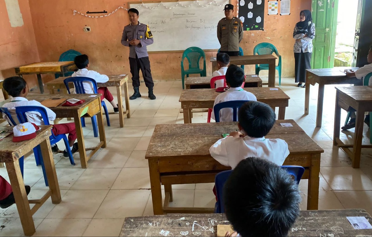 Kaur - Polsek Muara Sahung Polres Kaur Polda Bengkulu, melaksanakan program Police Goes To School di SDN 77 Kaur Kecamatan Muara Sahung Kabupaten Kaur, Senin (11/9/2023) pagi.