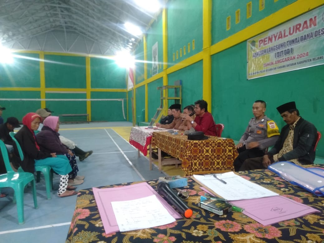 Rejang Lebong - Senin (23/12/2024) siang, Desa Warung Pojok, Kecamatan Sindang Dataran, Kabupaten Rejang Lebong, menggelar pembagian Bantuan Langsung Tunai Dana Desa (BLT DD) triwulan IV tahun 2024. Bantuan senilai Rp900.000 diberikan kepada 16 kepala keluarga penerima manfaat sebagai alokasi untuk bulan Oktober, November, dan Desember.