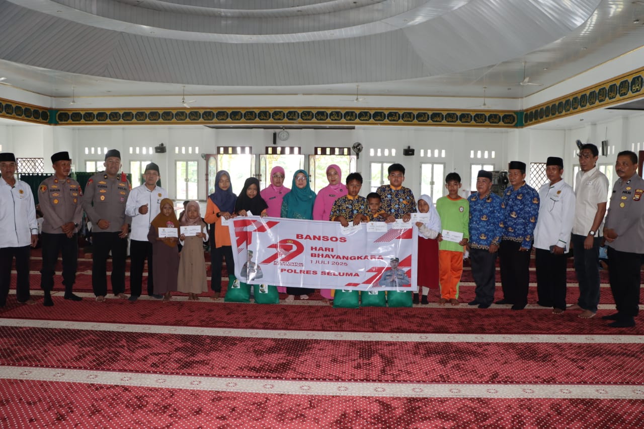 Seluma - Selasa tanggal 17 Juni 2025, Pukul 10.00 Wib Bertempat di Masjid Falihin Polres Seluma melaksanakan kegiatan Pembagian Bantuan Sosial kepada anak Yatim/Piatu dalam rangka memperingati HUT Bhayangkara ke 79