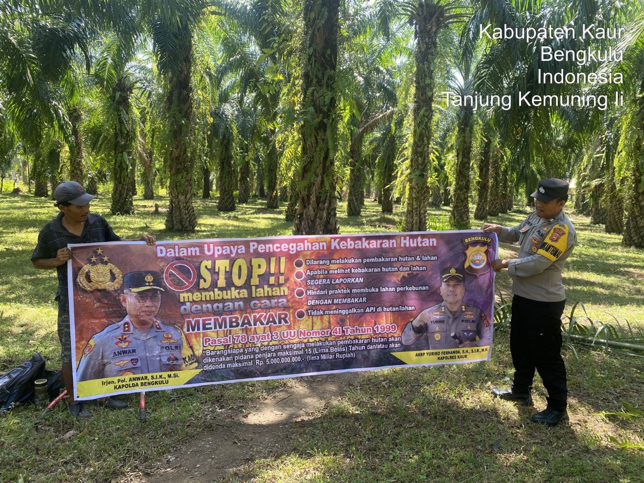 Kaur - Piket Yanmas Polsek Tanjung Kemuning Polres Kaur Polda Bengkulu, Aipda Endra berserta Briptu Ferry, dan Bripda Rasid melaksanakan Sosialisasi Larangan Pembakaran Hutan dan Lahan serta semak belukar (Karhutla) bertempat di Wilkum Polsek Tanjung Kemuning, Rabu, (04/09/2024), Sekitar pukul 09.00 Wib.