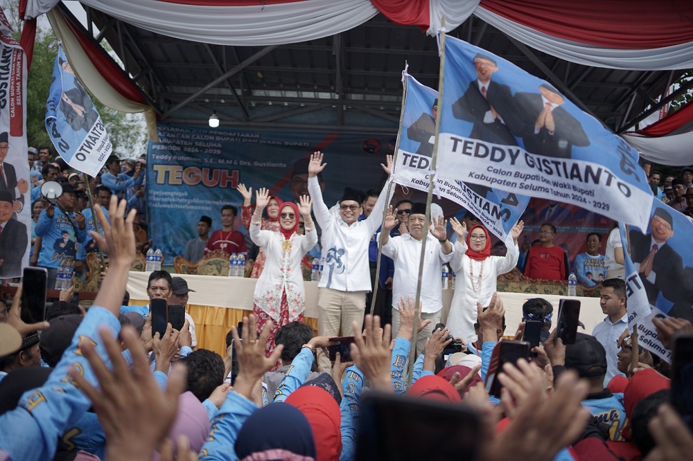 Pemandangan yang sangat menakjubkan, pasalnya sudah jarang terlihat puluhan ribu masyarakat berkumpul memakai seragam kaos biru bertuliskan Teddy-Gustianto (Teguh) mengusung tagline Seluma Emas.