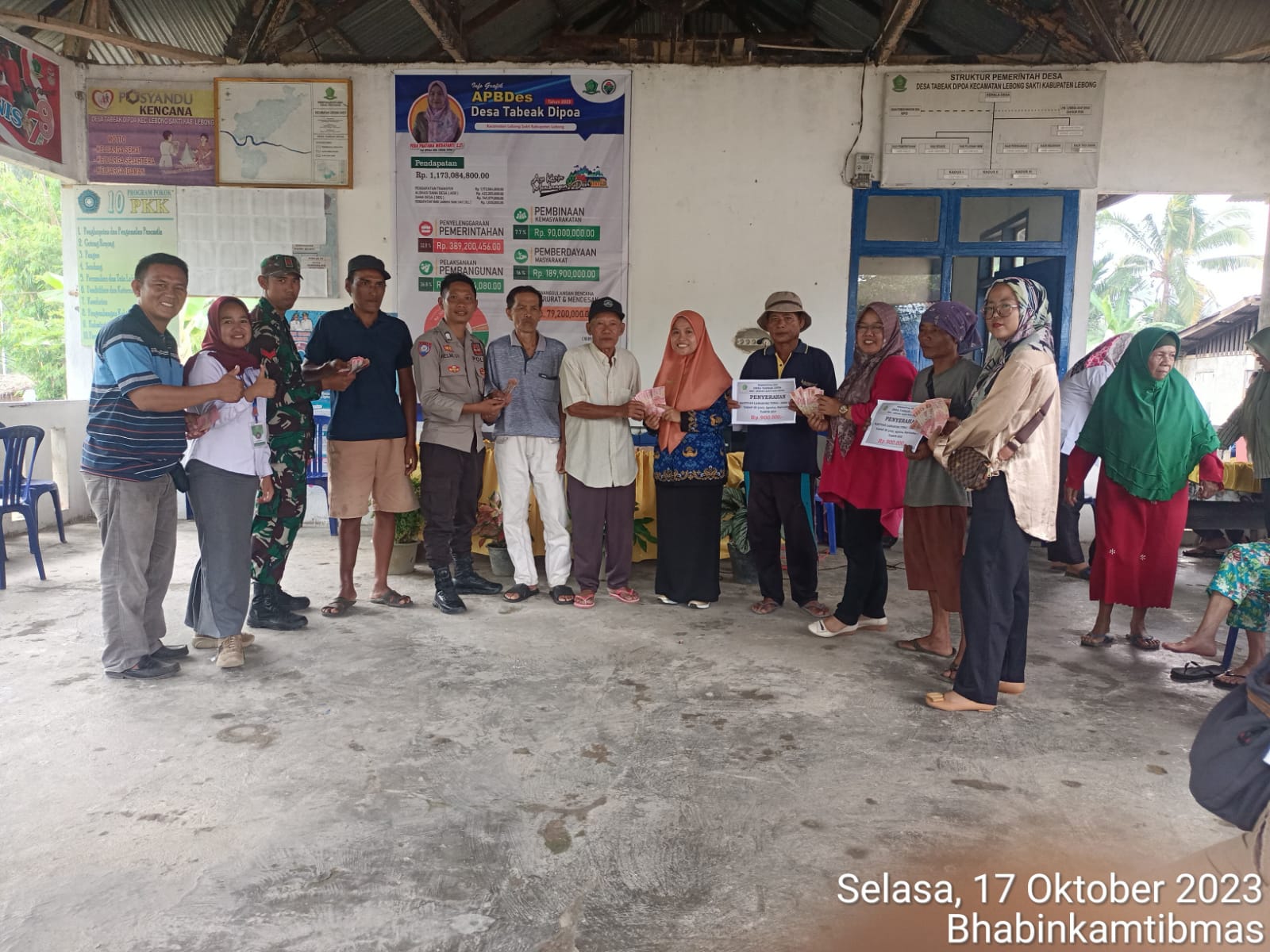 Lebong - Dalam kegiatan sambangnya, Bhabinkamtibmas Polsek Lebong Tengah Polres Lebong Polda Bengkulu, Bripka Helmi Syakbandi, menghadiri kegiatan penyaluran BLT DD di Desa Tabeak Dipoa Kecamatan Lebong Sakti, Kabupaten Lebong, Selasa (17/10/2023).