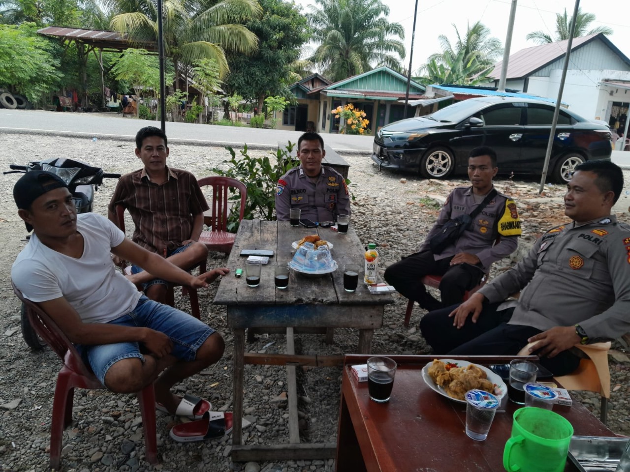 Kaur - Bhabinkamtibmas Polsek Tanjung Kemuning Polres Kaur Polda Bengkulu, Bripka M. Hedi Juliadi, S.H., berserta Bripka Panco, S.AP., Briptu Arif sambang Calon Kepala Desa Tanjung Bulan No urut 01 di Desa Tanjung Bulan Kecamatan Tanjung Kemuning Kabupaten Kaur, Pada hari Sabtu (14/10/2023) sekira Pukul 12.25 WIB.