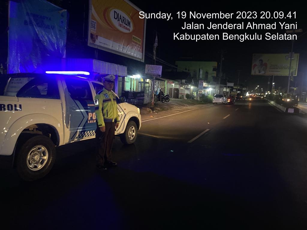 Bengkulu Selatan - Personel Sat Lantas dan Sat Samapta  Polres Bengkulu Selatan dipimpin oleh Kanit Turjawali Ipda Sudarminta melaksanakan patroli stasioner dan hunting antisipasi Curat, Curas dan Curanmor,  balap liar dan knalpot Racing serta ranmor tanpa TNKB di Jalan A.Yani dan Sudirman serta Jalan Padang Panjang depan Pemda Bengkulu Selatan pada Minggu dini hari  (20/11/23) pukul 01.00 WIB.