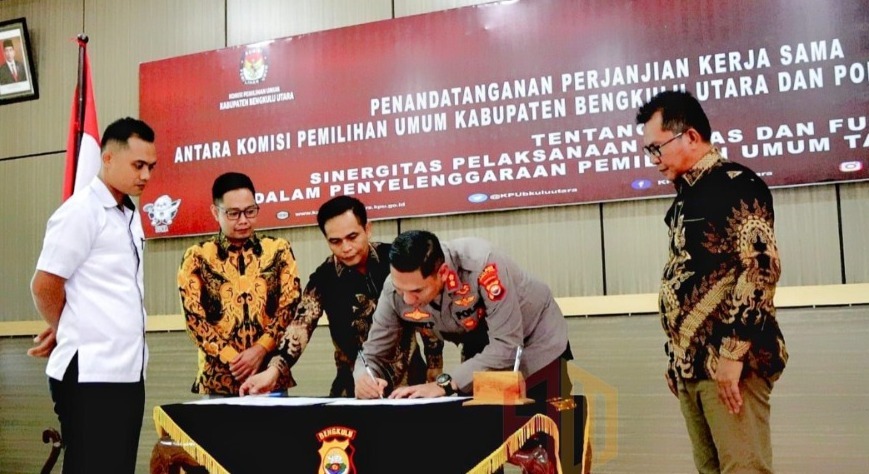 Penandatanganan dilakukan antara Kapolres Bengkulu Utara AKBP. Andy Pramudya Wardana, S.IK, MM dan Ketua KPU Suwarto, SH.