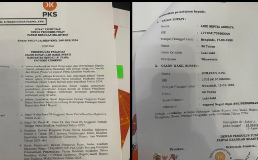 PKS Serahkan B1 KWK ke Arie - Sumarno di Pilkada Bengkulu Utara