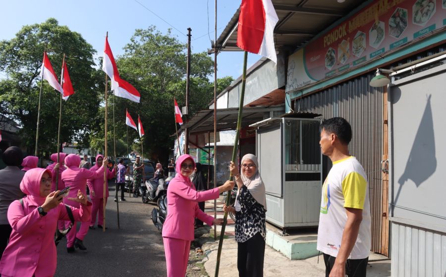 Sambut HUT RI ke-80 : Kapolresta Bengkulu Bersama Bhayangkari dan Personel Bagikan dan Pasang Bendera Merah Putih di Rumah Warga