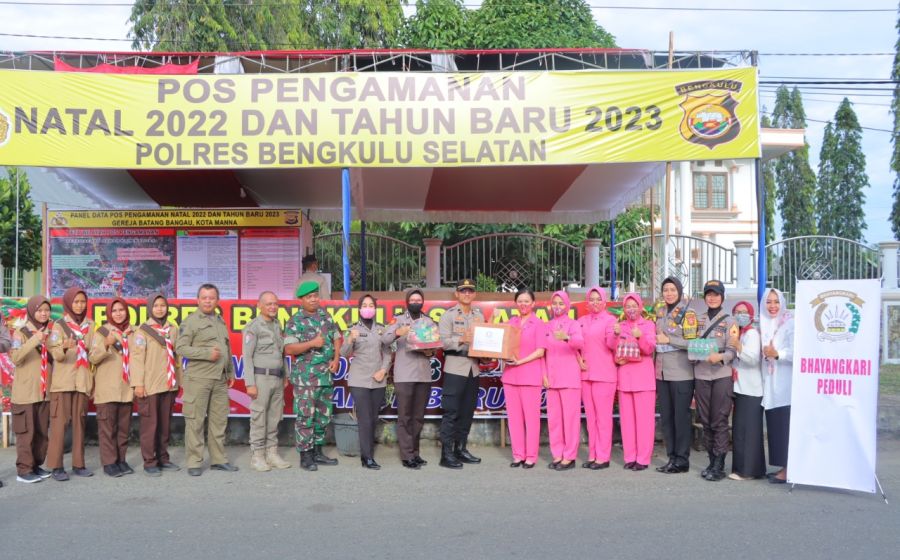 Kunjungi Pos Pam dan Pos Yan Nataru, Bhayangkari Peduli Polres Bengkulu Selatan Bagi Bingkisan