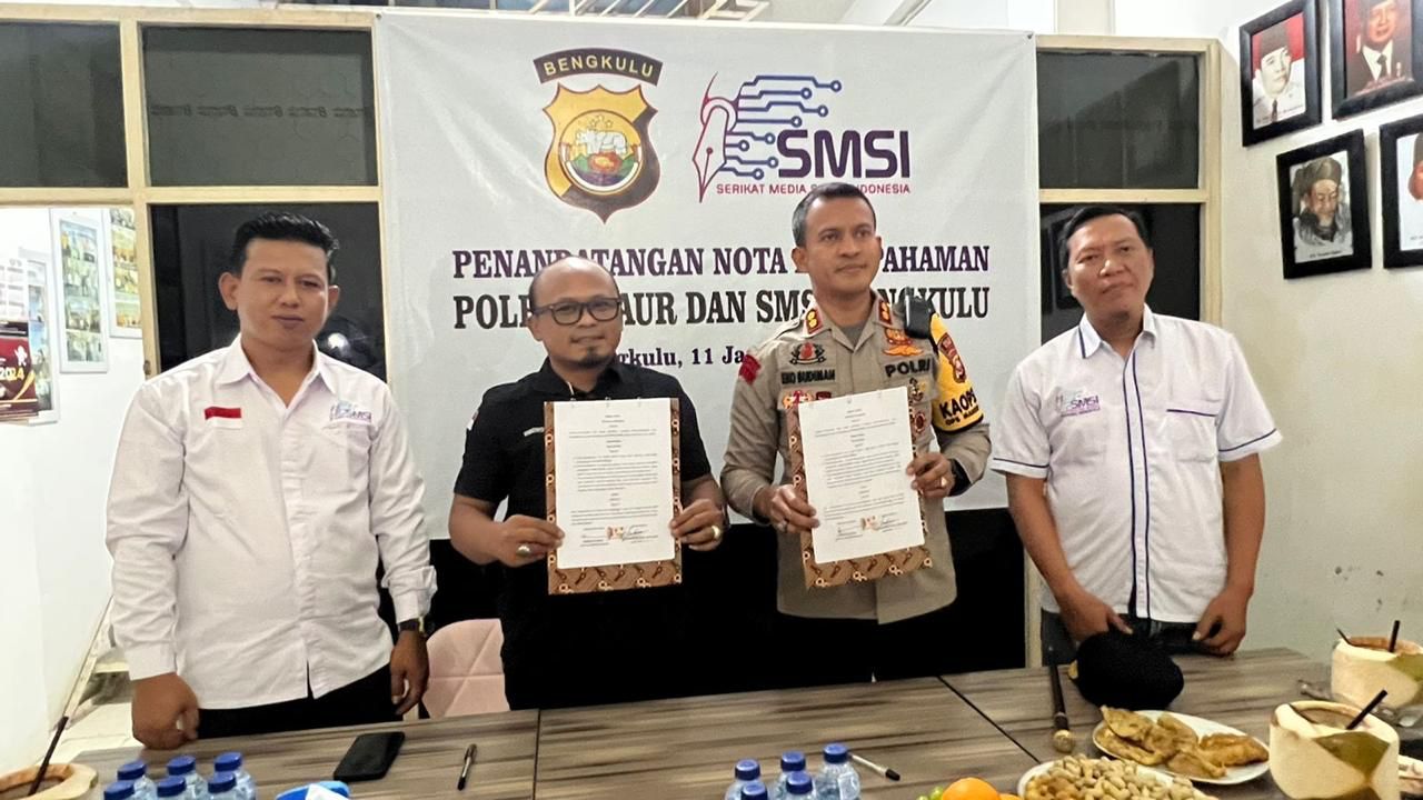 Bengkulu - Kapolres Kaur Polda Bengkulu AKBP H Eko Budiman, S.I.K., M.I.K., M.Si., dan Ketua Serikat Media Siber Indonesia (SMSI) Provinsi Bengkulu Wibowo Susilo menandatangani nota kesepahaman atau perjanjian kerjasama, di Kantor SMSI Bengkulu, Kamis (11/1/2024).