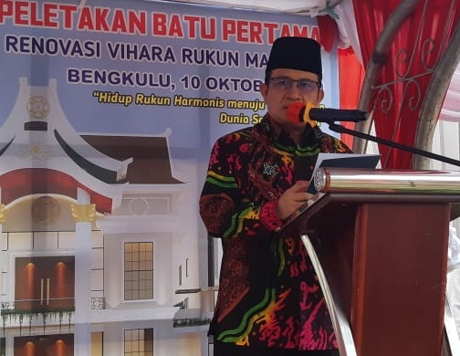Diakhir penyampaiannya, Kakanwil mendukung serta menyampaikan apresiasi atas pemugaran dan peletakan batu pertama pembangunan Vihara Rukun Maitrea Kota Bengkulu ini.