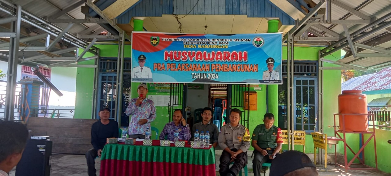 Bengkulu Selatan -  Giat Kapolsek Pinoraya  IPTU Agus Apriwinata S.Sos M.si diwakili Bhabinkamtibmas BRIPTU Otnel Valentinus, monitor dan Binluh Musdes pra pelaksanaan Pembangunan tahun 2024 di desa Nanjungan Kecamatan Pinoraya Bengkulu Selatan, pada  Selasa (04/06/2024) pagi.